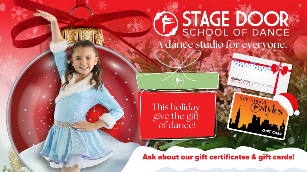 “Give the Gift of Dance” this holiday season with a Stage Door School of Dance gift certificate or Stage Door Styles gift card. Whether it’s for classes, events, or SDSD swag, these thoughtful gifts open the door to creativity, growth, and the joy of movement—perfect for dancers of all ages and skill levels.