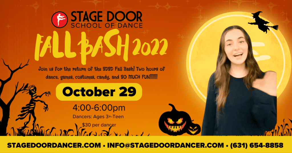 It’s time to get spooky, dancers. Join us for the return of the SDSD Fall Bash on October 29 from 4:00pm-6:00pm right here at Stage Door School Dance!