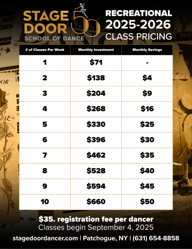 For 10+ hours of class per dancer, please contact info@stagedoordancer.com or call (631) 654-8858 for pricing and more information.