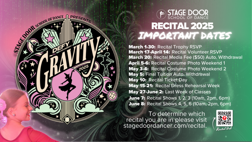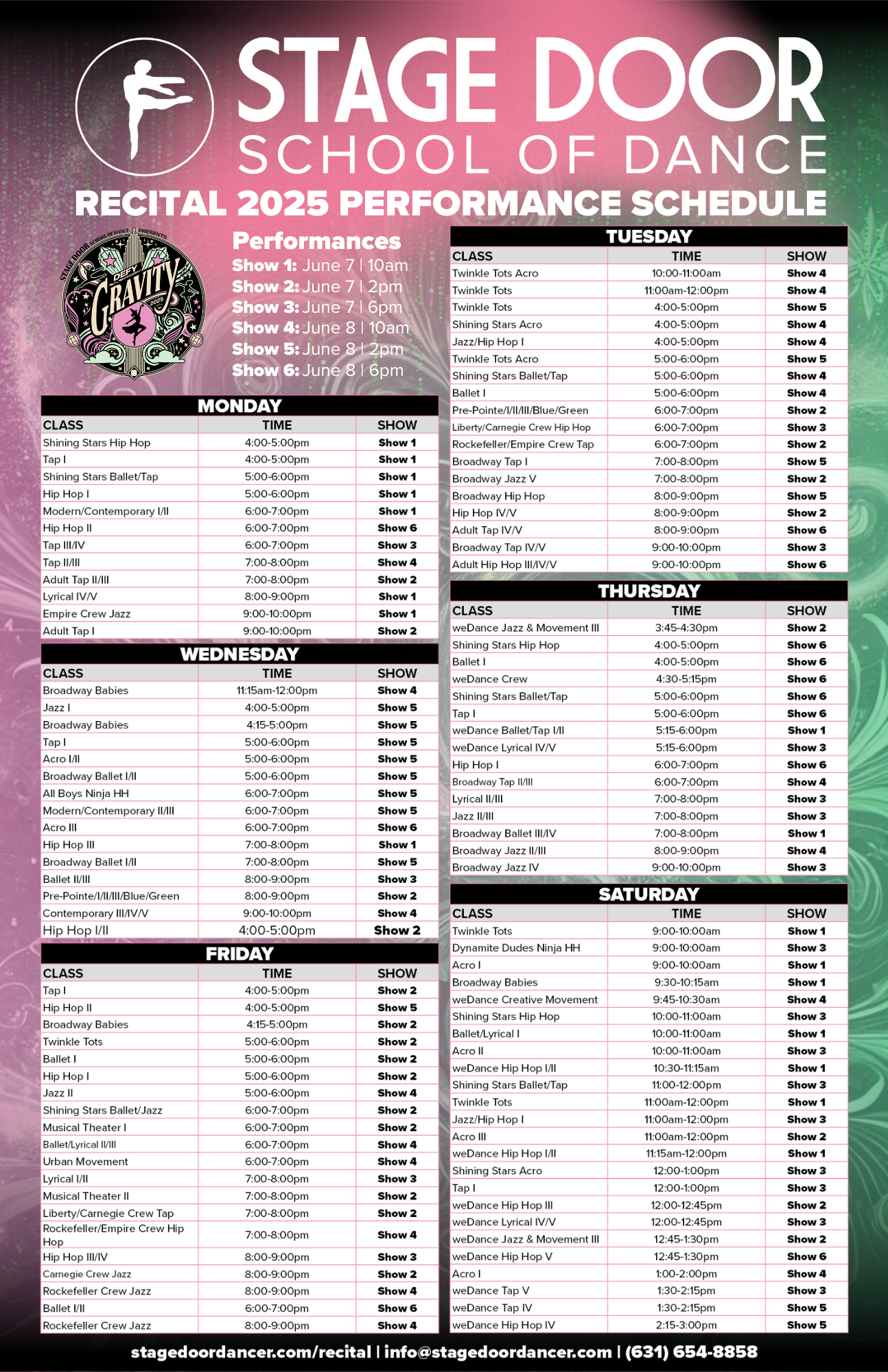 *Please note: The 2025 recital performance schedule was predetermined at the beginning of the dance season based on your dancer’s class(es). Locate your dancer’s performance show number which corelates to the dates above by >>> clicking here.
