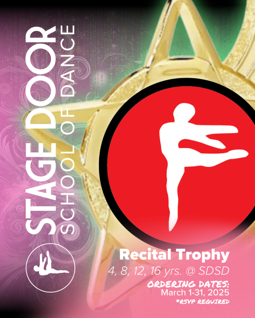 Have you or your dancer appeared in 4, 8, 12, or 16 Stage Door School of Dance recitals? It’s time to celebrate you at this year’s annual recital by presenting you with an official SDSD Recital Trophy live on stage!