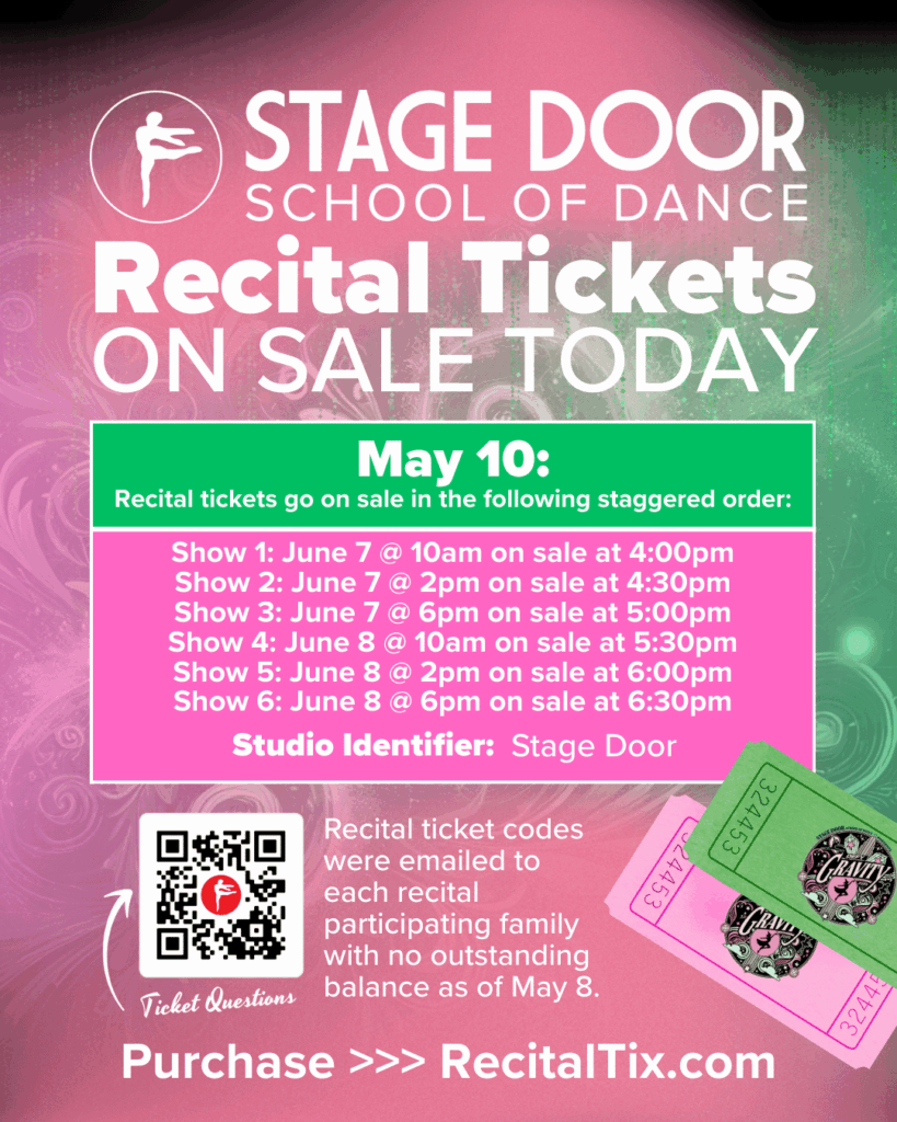 Recital Ticket Sales: Tickets will go on sale for all SDSD families on May 10 via RecitalTix.com with a staggered release of tickets based on your dancer’s performance date and time, which can be located – here.